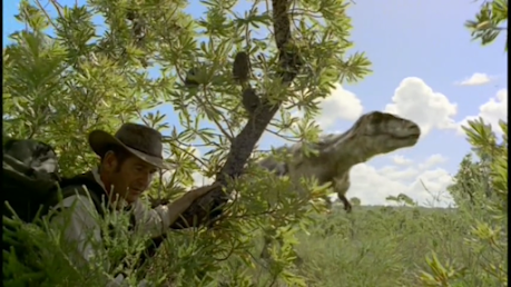 Nigel then reaches a lake, and has decided to wait for the therizinosaurus to come there. He finds bones of it, and is puzzled by how its teeth are leaf-shaped, suggesting its a herbivore. He doesn't have long to muse for long, as the raptors arrive and for no reason I can understand, start chasing the crew and him, only relenting when Nigel scares them off with an airhorn. Nigel arrives back on the lakeshore to find a Tarbosaurus has come to drink.