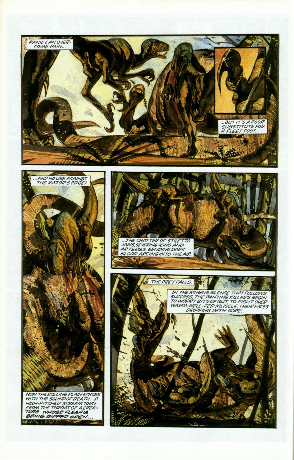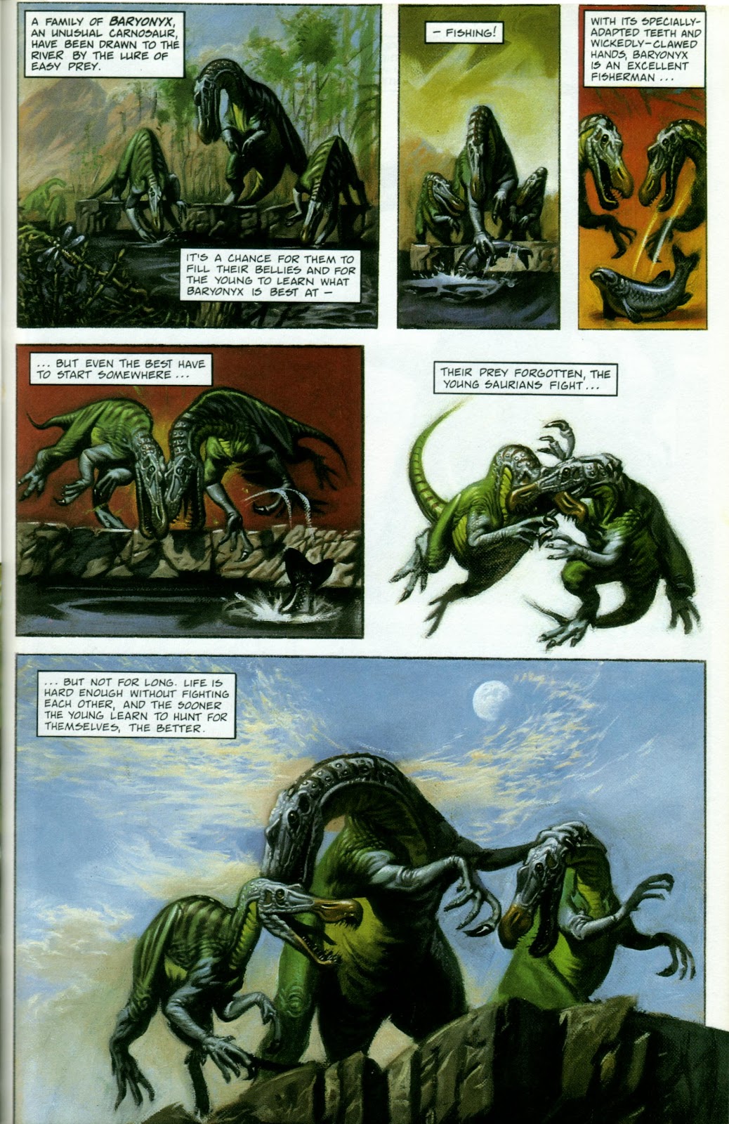 First off, I love the artwork here courtesy of Richard Dolan. Its not only vibrant, but detailed. It reminds me of the likes of Frank Frazetta's style. The story is also quite good, with the behaviour standing out: I like the mother Baryonyx hissing and defending her young while fleeing from sauropods she would have no chance against, as well as them diving to escape predators. No awesomebro fights here people!