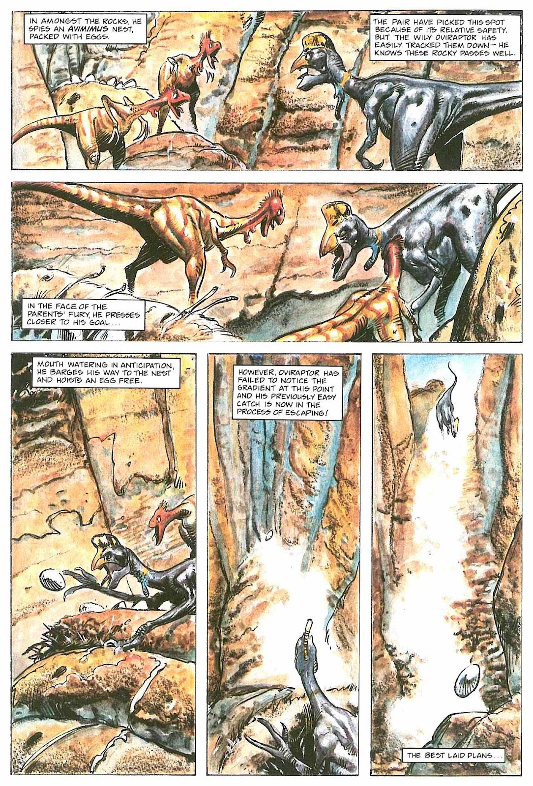 We're continuing Marvel's 1992 miniseries of dinosaur comics, Dinosaurs: A Celebration with the second issue (read here - at your own risk), this issue focusing on small theropods and sauropods. First, observe the Oviraptor (drawn by John Bolton) on the cover, and boy its excellent. it really nails the downright alien bird feel that oviraptorids had, helped by it resembling a macaw due to the stripes on the chees and general head colours. It's even got feathers on it, not too bad for 1992. The detail also deserves mention: notive the holes and scratches in the beak, or the texture of the feathers. Not to sure about the wide tongue though, as I lean more to it having a thin, immobile tongue. The weirdly vampiric-looking teeth (while accurate) are also off to me.
