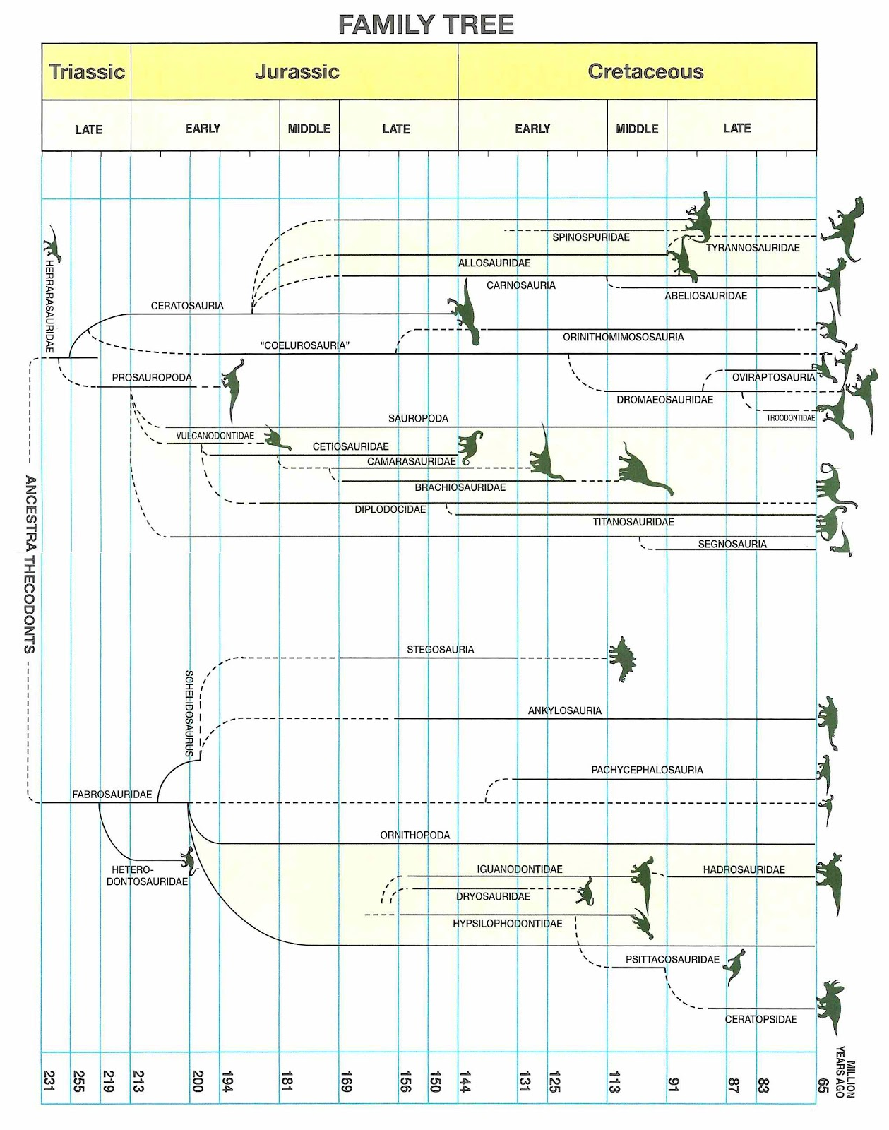- The family tree in the first chapter and taxonomy (and the series as a whole) are obviously outdated: two major offenders are that carnosaurs and coelurosaurs are separate clades based on size alone (nope, they were multiple clades) and segnosaurs are sauropod relatives (they're theropods, and isn't even real anymore, just therizinosaurs).