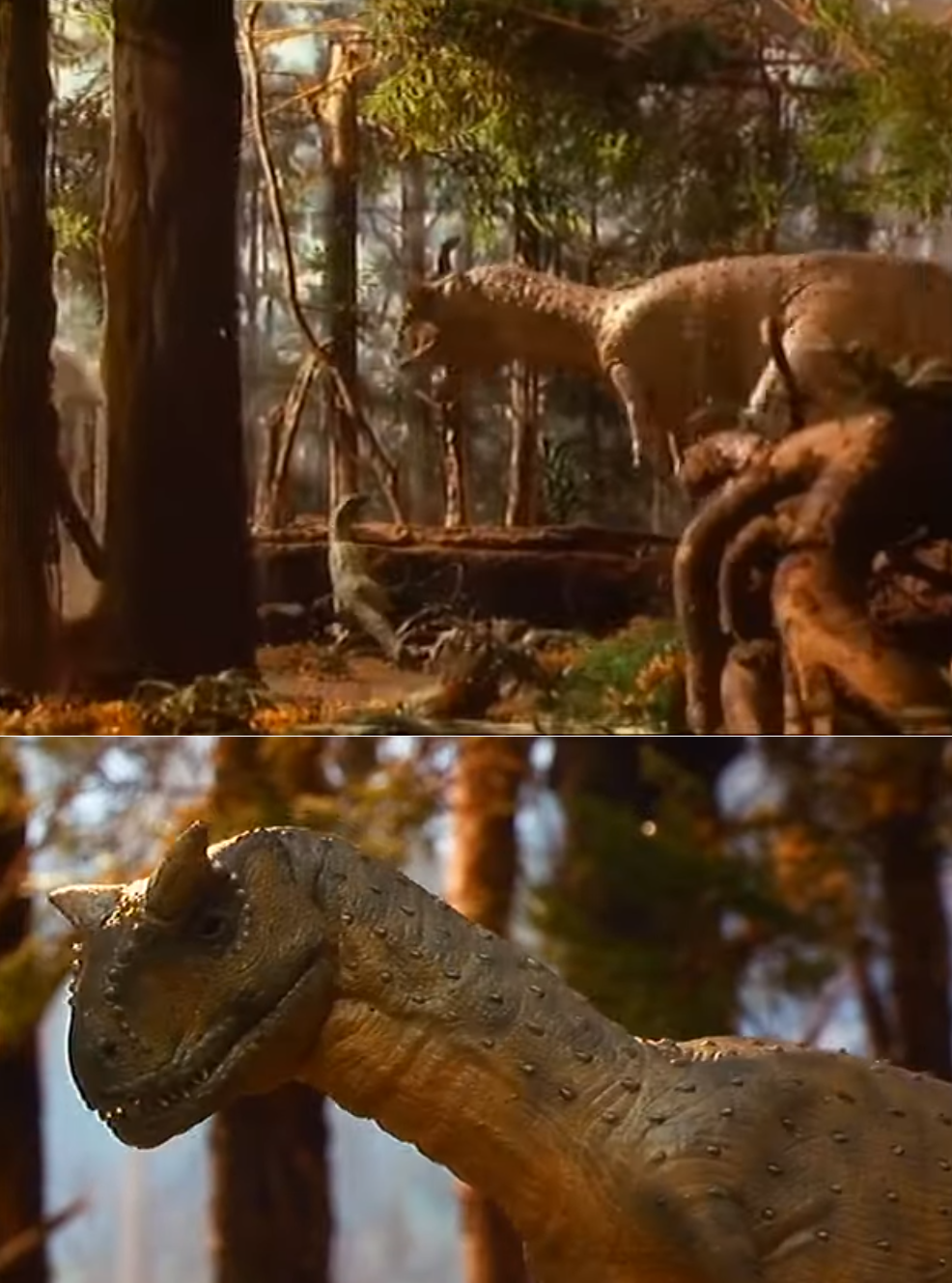 That aside, the theropod's scene is nice, especially how roars heard first before it appears and the zoomig in tracking shot. However, the way it ust stops for literally a minute or so to roar and thrash its head about seems rather odd, and if it weren't for its prey being so slow to escape they would have gotten away. The design is still pretty good though, even with oversized arms.
