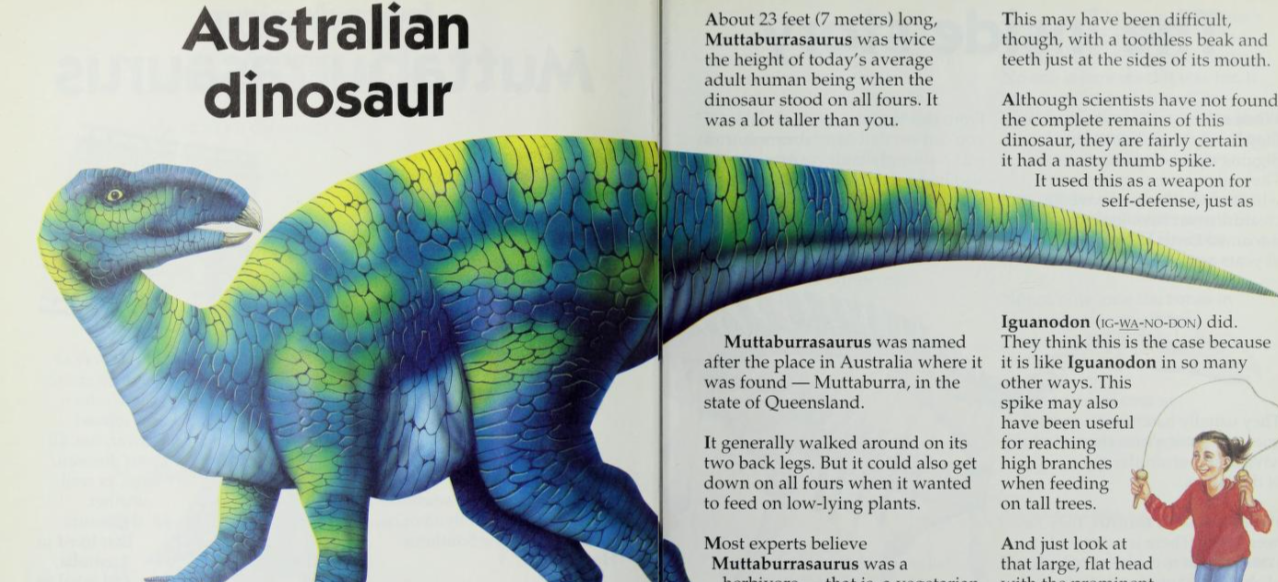 - Two or three freespace pages that vary by subject, often seeming random as possible. For example, the book on Ouranosaurus has a spread on dragons, the only connection being that its sail make it kind of (and I stress that bit) look like dragons' wings.